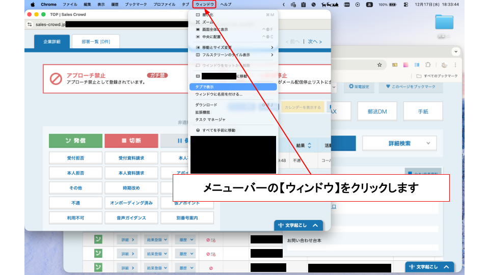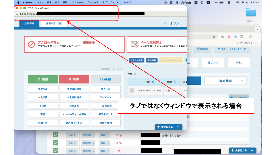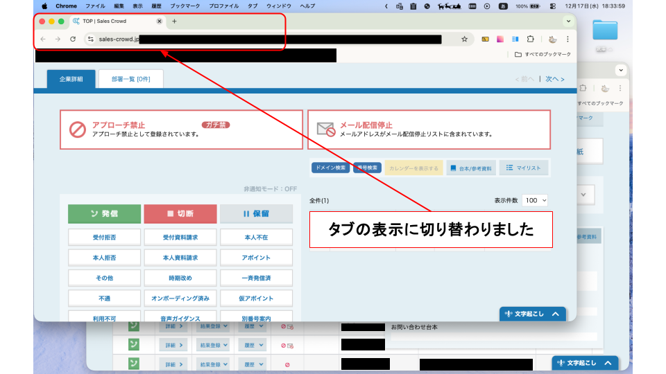 色は変わらないが機能はしている:ページが完全に読み込まれていない状態のため、一度架電をストップして画面を読み込み直してみましょう。ただしリストでオートコールを使用している場合、読み込み直すとリストの先頭に戻ってしまうため読み込むタイミングにご注意ください。登録前の場合は必ず登録後に行なってください。>>Ctrl(⌘command)+shift+Rキー 色は変わらず、機能もしない:一度Sales Crowd(セールスクラウド)をログアウトし、再ログインしてみましょう。またポップアップとリダイレクトがブロックされている場合は必ず許可しましょう。 ※ログアウト>>右上の自分の名前にカーソルを合わせて「ログアウト」をクリックします。タブを✕で閉じてもログアウトにはなりません。 不具合を繰り返す場合は基本の対処法をお試しください。