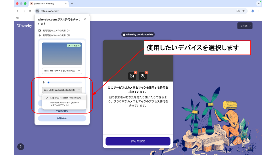 デバイスの指定ができる場合は、ここで任意のデバイスを指定しておきます。 ※こちらの表示が出ない場合もありますので、その際は「許可する」だけを選択すればOKです。