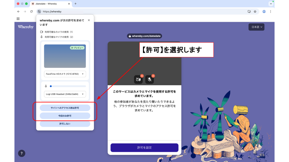 「今回は許可」または「すべてのアクセスで許可」を選択します。 ※「今回は許可」を選ぶと次回入室時も許可するか確認されます。